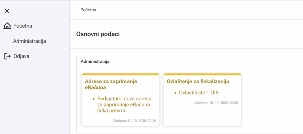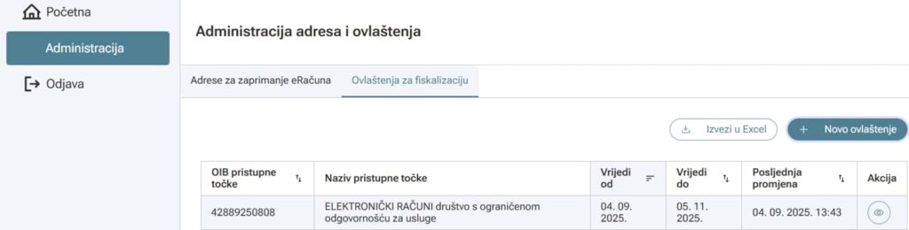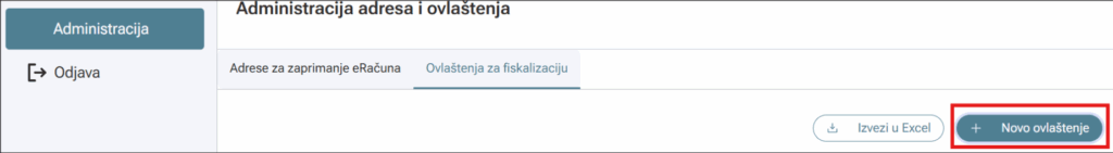 Klikom na opciju Administracija i Ovlaštenja za fiskalizaciju, otvorit će vam se sljedeće sučelje: